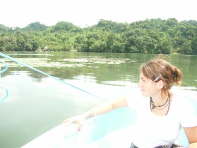 Mit dem Boot abgeholt direkt an der Backpackerinsel,...den Rio Dulce entlang nach Livingston -was fuer eine schoene Gegend mal wieder! Ein unglaublich breiter Fluss - eigentlich eher das Verbindungsstueck zwischen See und Meer - und drumherum ragen riessige baumbewachsene Berge ... hie und da ein kleines von Voegeln (Kranichen und so) bevoelkertes Inselchen, ...dann mal ein kleiner Stop an einer Schwefelquelle,... Seerosen,.... leider sind wir ziemlich durchgeheizt und konnten durch den Laerm des Motorbootes die faszinierene Stimmung da nicht ganz so wahrnehmen, wie man es mit sicherheit in einem dieser 1-2 Mann Baumkanus, die die Fischer dort verwenden, koennte. Allerdings haetten wir damit auch statt ca. einer Stunde mindestens 3 Tage gebraucht (vor allem wenn wir weiterhin sooft abgesoffen waeren...!)
